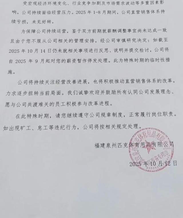 10月13日,多個媒體報道稱,有相關員在社交媒體上透露匹克公司向拒絕降薪的員工發(fā)出“最后通牒”,要求其在10月14日前提交“反思檢討”,否則將面臨停發(fā)9月份工資的處罰,并且還貼出了蓋了匹克公司紅章的文件。