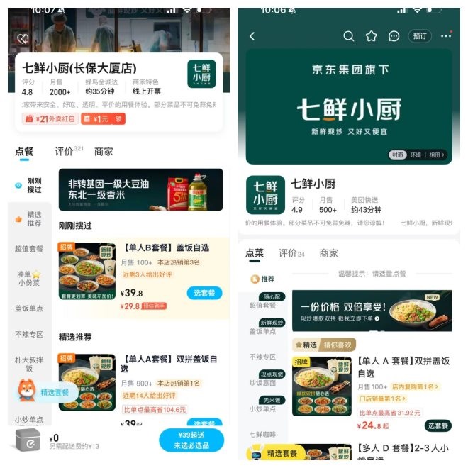 京東七鮮小廚分別進(jìn)駐淘寶閃購(gòu)(左)、美團(tuán)(右)