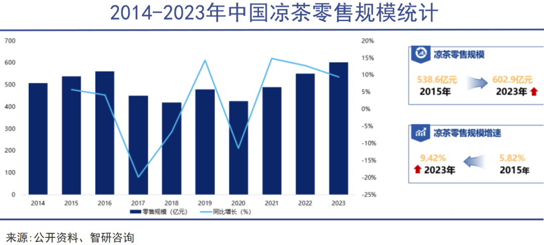 數(shù)據(jù)是直觀清晰的。根據(jù)智研咨詢發(fā)布的《2024—2030年中國涼茶行業(yè)市場需求分析及投資方向研究報告》,自從2016年之后,中國涼茶零售規(guī)模就開啟了上上下下的震蕩模式。而從2014年—2023年的總體規(guī)模來看,十年來增幅約在20%左右,明顯已經(jīng)進入了增長停滯區(qū)間。