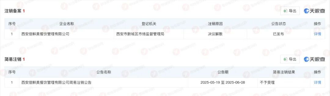 這場閉店潮并非毫無征兆。往前倒推三個月,其關(guān)聯(lián)主體西安倍鮮美餐飲管理有限公司就新增了注銷備案;而更早之前,該公司曾嘗試啟動簡易注銷程序,但最終不了了之。