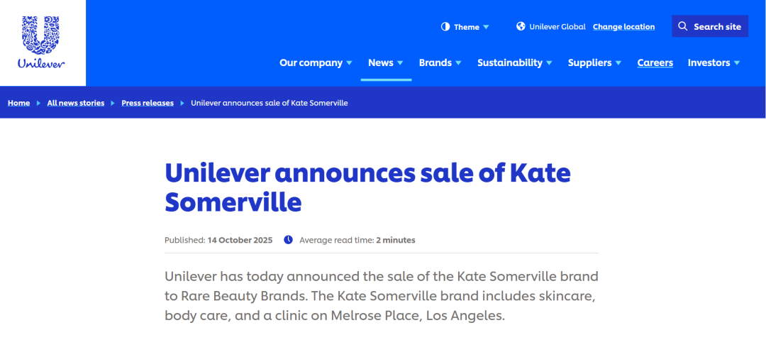 日前(10月15日),聯(lián)合利華在其官網(wǎng)宣布,正在將凱詩薇出售給獨(dú)立美容品牌孵化公司Rare Beauty Brands,交易預(yù)計(jì)將于2025年第四季度完成,具體交易金額暫未披露。