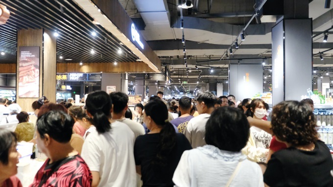 烘焙熟食區(qū)成為增強“煙火氣”的關鍵,現(xiàn)場制作包點、炸物、烤類、輕食、鹵味等,網紅商品如手撕雞、熱鹵甜腸、北京烤鴨、涼皮、榴蓮千層蛋糕等琳瑯滿目,讓顧客在賣場即可品嘗新鮮美食。
