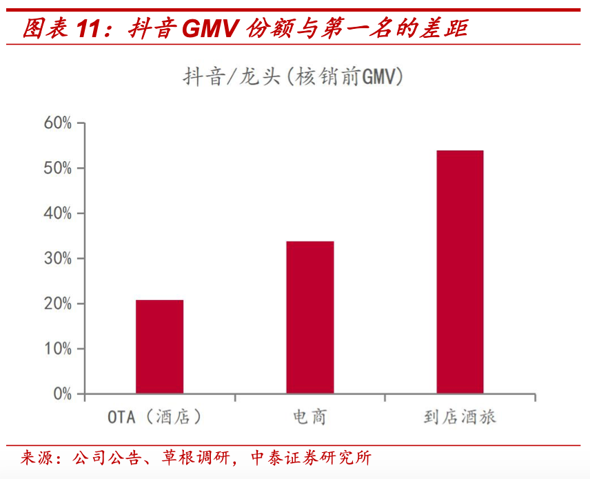 據(jù)中泰證券估算,抖音在 OTA 行業(yè)的市場份額上升較為緩慢,預(yù)計核銷前 GMV 僅為攜程 20%左右,遠低于在電商、到店領(lǐng)域的份額。進一步考慮顯著偏低的抖音酒店核銷率,實際份額差距更大。