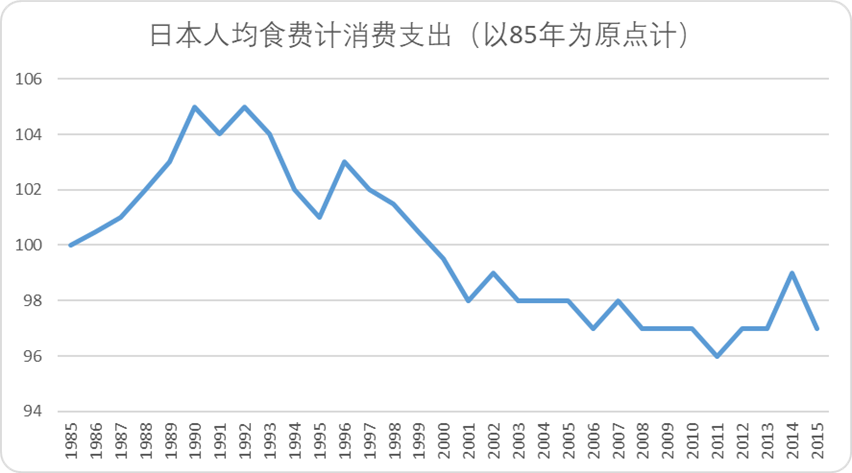 從絕對(duì)值看,日本家庭每月食品支出從1992年的8.2萬日元跌至2000年的7.4萬日元。但比起其他消費(fèi)的“跳崖式下跌”,餐飲業(yè)堪稱“泡沫時(shí)代的防波堤”。