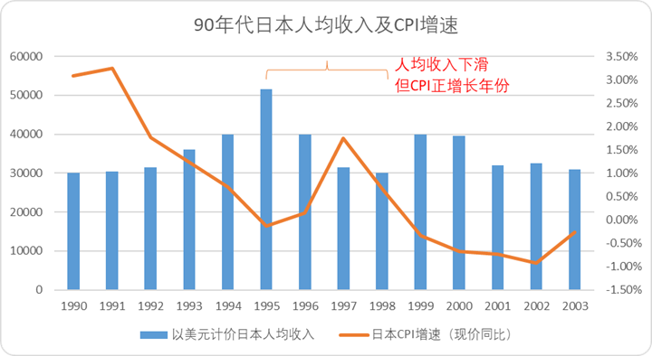 圖:90年代日本人均收入(以美元計(jì))及CPI增速,來源:Choice金融客戶端