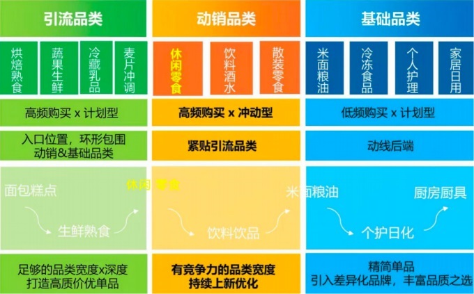 重新定位品類角色,引流品類為烘焙熟食、蔬果生鮮、冷藏乳品、麥片沖調(diào)等,這些是高頻購買,是計(jì)劃型的,在入口位置環(huán)形包圍,要有足夠的品類寬度、深度,打造高品質(zhì)優(yōu)單品,這是引流分類。