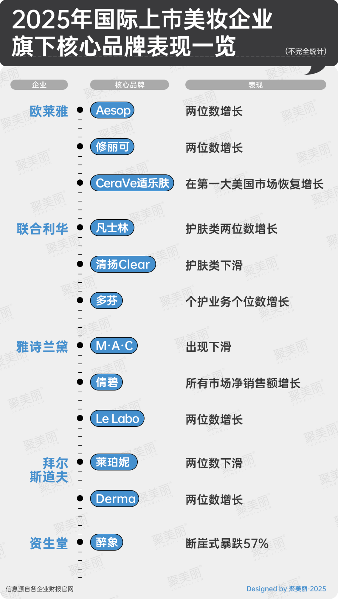 從業(yè)績角度來看,近年來的確有充斥著部分高端美妝“不行了”的聲音,下圖可見,拜爾斯道夫旗下的萊珀妮出現(xiàn)兩位數(shù)下滑,雅詩蘭黛集團的核心彩妝品牌M·A·C也遭遇市場冷遇,其業(yè)績波動正是拖累集團彩妝板塊整體表現(xiàn)的主因。