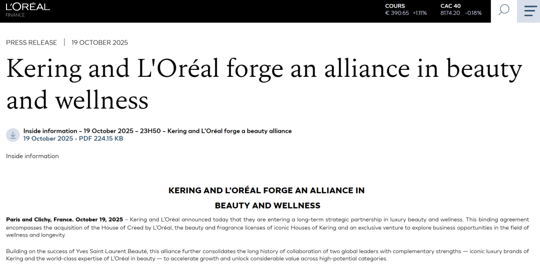 將旗下Kering Beauté(下稱:開云美妝)、高端香氛品牌Creed出售給歐萊雅集團,收購?fù)瓿珊螅珻reed將加入歐萊雅高檔化妝品部;