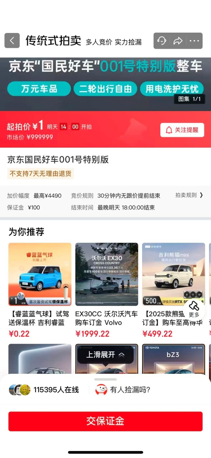 據(jù)多家媒體報(bào)道,“國民好車”尚未正式開售,其001號車已先行亮相京東拍賣頻道,以1元起拍價(jià)開啟預(yù)訂。此次拍賣從10月17日16時(shí)開啟線上預(yù)約,將于10月22日14時(shí)開拍,18時(shí)結(jié)束,整個(gè)競價(jià)過程持續(xù)4小時(shí)。001號車的最終成交價(jià)將完全由用戶競拍決定。截至發(fā)稿,拍賣頁面預(yù)約量已超3.5萬。
