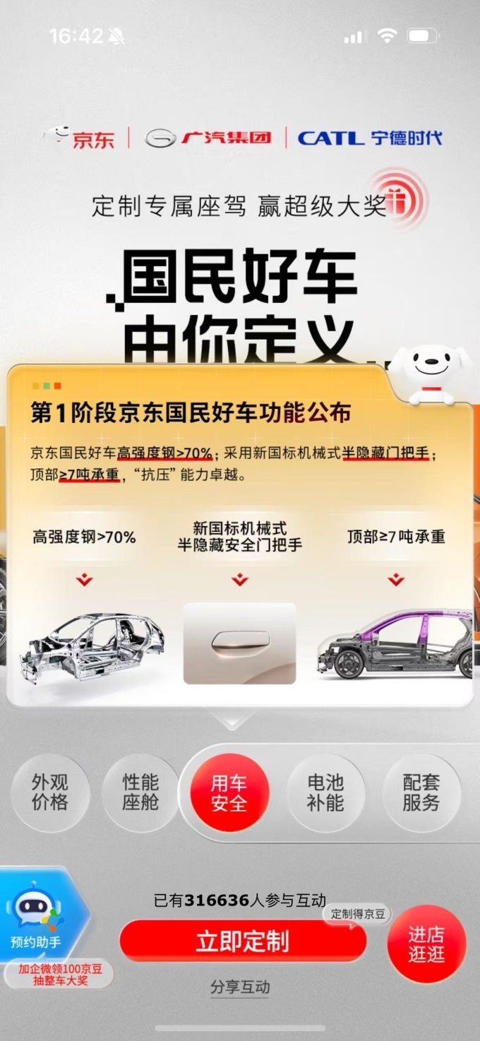 此外,京東還推出互動頁面收集用戶反饋,互動主要圍繞“安全、性能、電池、服務(wù)、價(jià)格、外觀”多維度展開。用戶在京東APP搜索“國民好車”即可參與,截至目前,參與人數(shù)已近30萬。
