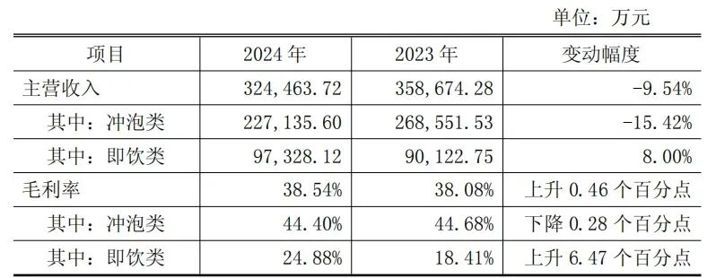 銷量方面,2024年香飄飄沖泡奶茶銷量為9.84億杯,即飲類銷量為3.84億杯,兩者合計較2023年減少了1.23億杯。