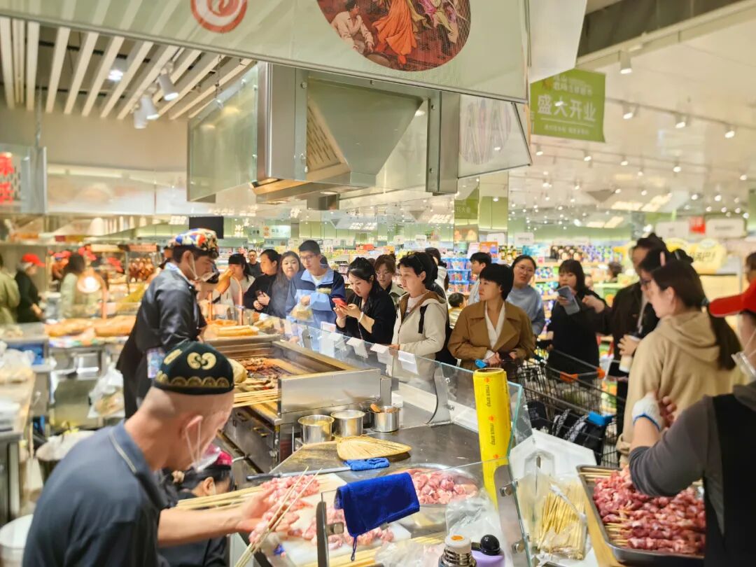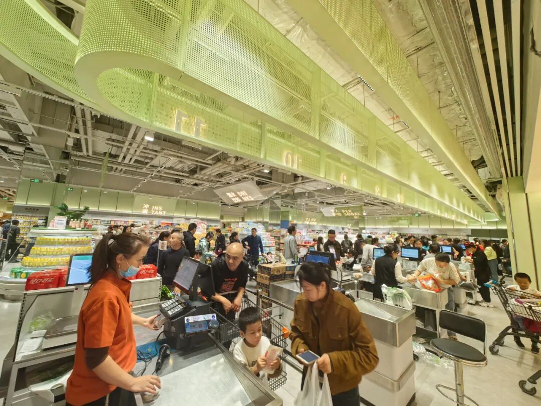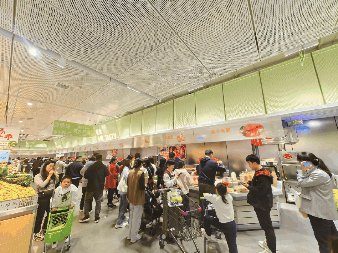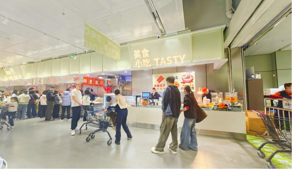門店以“餐超結(jié)合”的模式,設置大面積餐飲區(qū),明廚亮灶,所有美食現(xiàn)場制作,讓顧客可清晰地看到食材品質(zhì)與制作全過程,為居民打造“購物+用餐”的一站式服務場景。