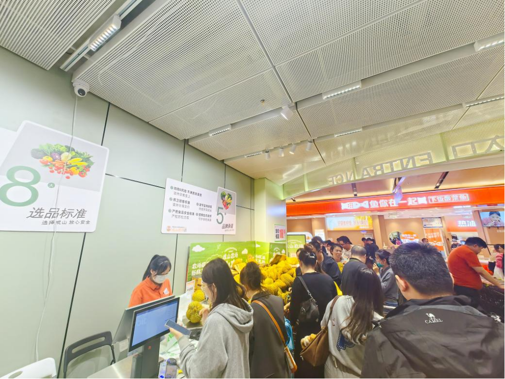 入口處排隊買榴蓮一直持續(xù);一系列鮮食加工項目,有序地安排在一條L型動線下,成了賣場的人流中樞,多個項目人流聚集;重復陳列的自有品牌量感凸顯,處處昭示著“成山品質(zhì)”;店招前面,甚至有年輕顧客合影拍照,這對超市品牌來說,很少見……