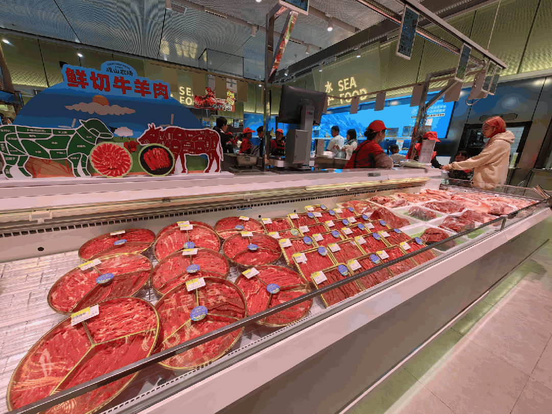 肉品區(qū):牛肉拼盤、各種鮮禽、豬肉部位肉分割精細,專業(yè)水平較高;同時,潮汕南興號肉丸設置專區(qū),專人服務推薦,強化了優(yōu)勢地理單品心智。