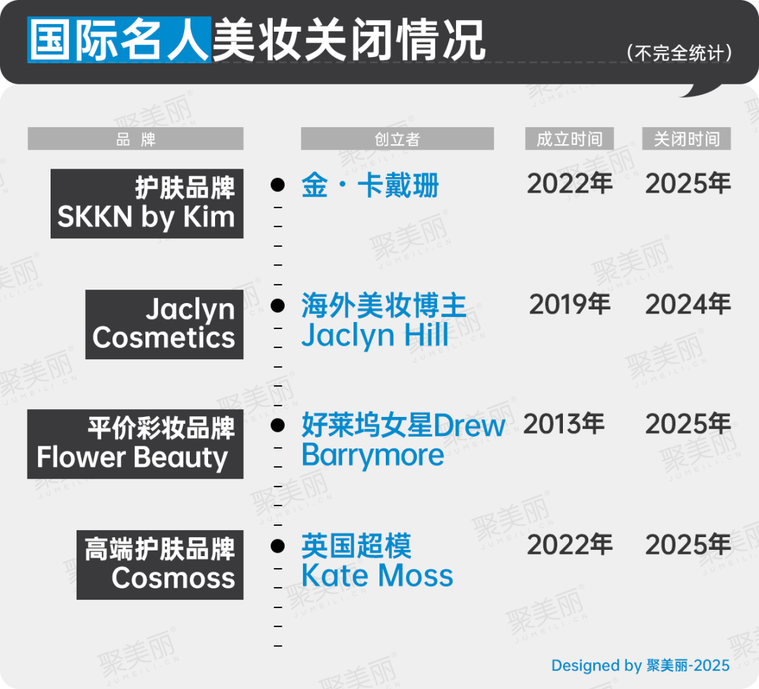 其中,金·卡戴珊創(chuàng)立的護(hù)膚品牌SKKN by Kim和英國(guó)超模Kate Moss的高端護(hù)膚品牌Cosmoss均僅存活了3年。