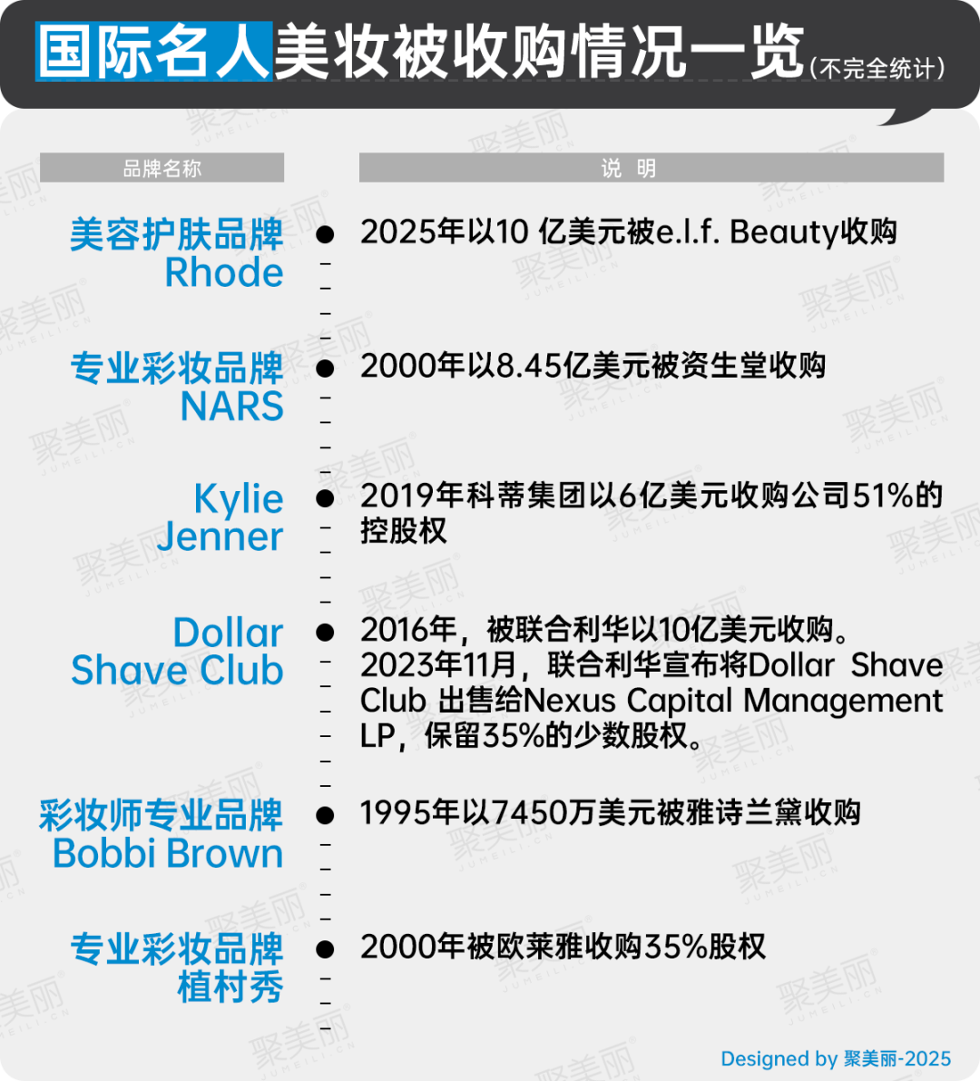 如下圖所示,不少名人美妝的收購(gòu)方都是大型國(guó)際美妝集團(tuán),且收購(gòu)金額巨大。
