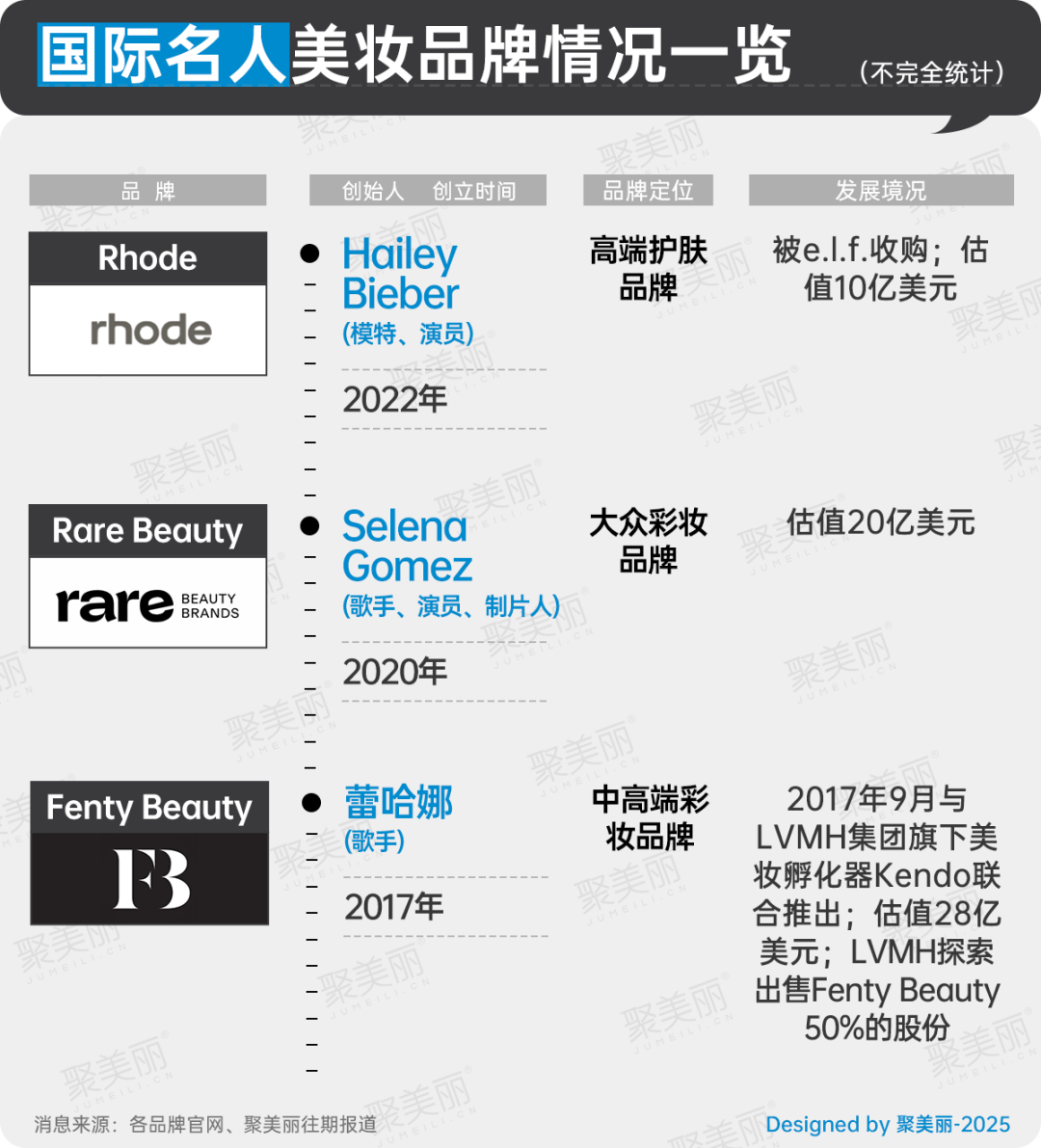 其中,F(xiàn)enty Beauty與LVMH集團(tuán)聯(lián)手孵化,海莉·比伯的Rhode獨(dú)立推出后被收購(gòu);美國(guó)歌手賽琳娜的Rare Beauty則獨(dú)自擁有品牌所有權(quán)。