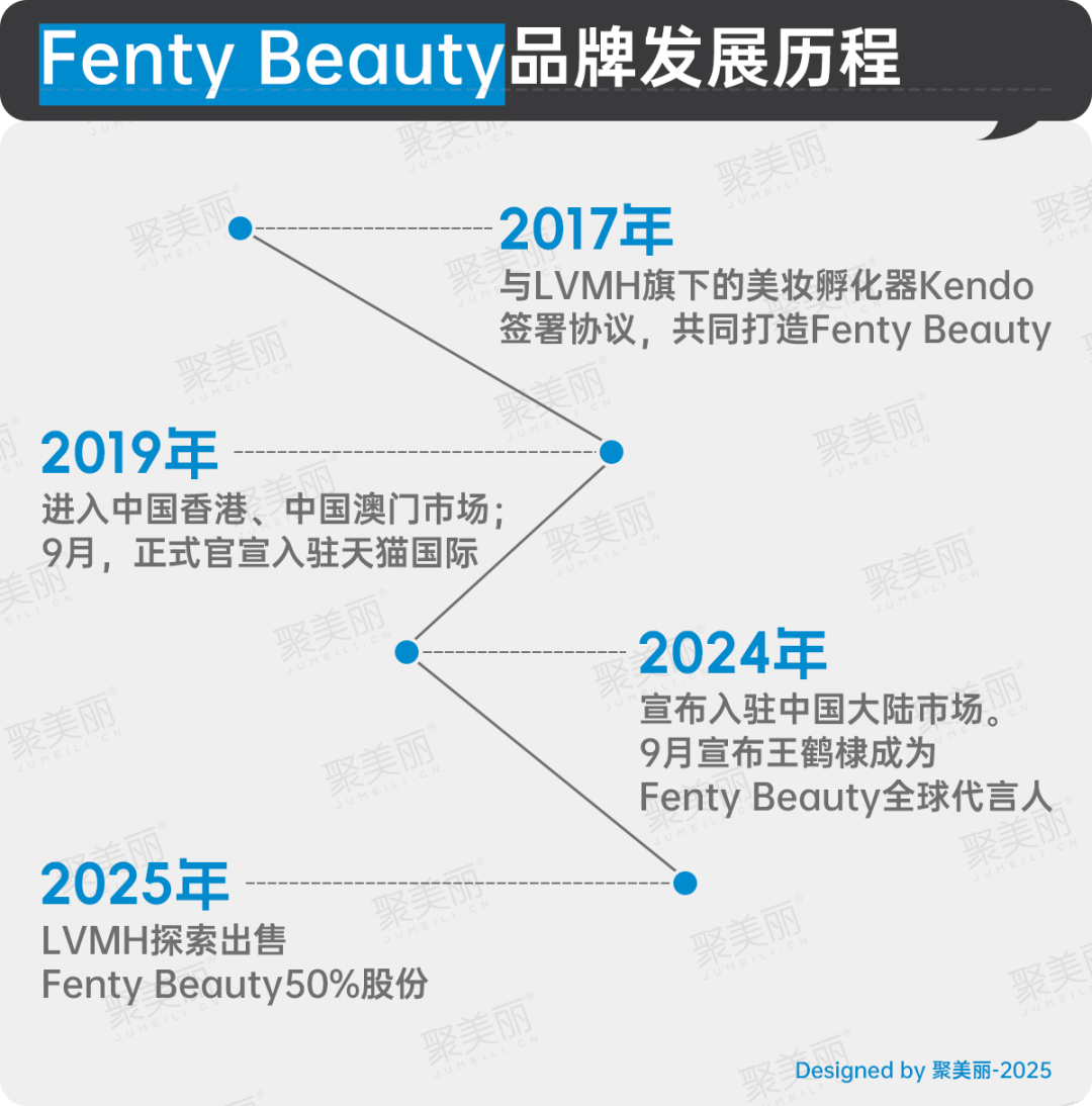 回顧其發(fā)展歷程來(lái)看,F(xiàn)enty Beauty已經(jīng)成立8年。2017年,Rihanna與LVMH旗下的美妝孵化器Kendo簽署協(xié)議,共同打造Fenty Beauty。2019年,進(jìn)入中國(guó)香港和澳門市場(chǎng),同年9月宣布入駐天貓國(guó)際。