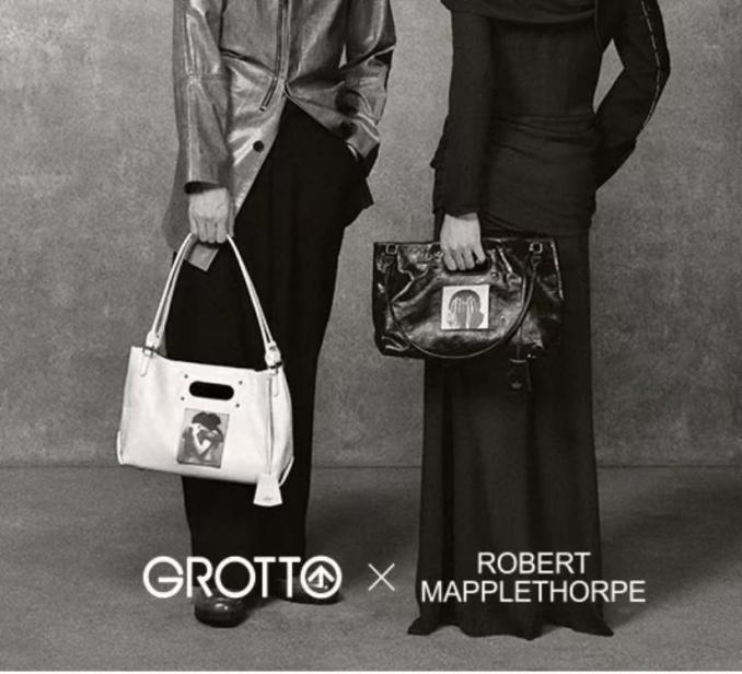而從品牌文化傳播來看,GROTTO和山下有松的步調比較一致, 前者近期剛剛展開一場“多元創(chuàng)作者談話”,參與者多是一些前沿藝術家,同步進行的品牌聯名選擇的是前衛(wèi)攝影師梅爾索普。不過對比山下有松更具群眾基礎的“東方敘事”,GROTTO 更注重小眾、前衛(wèi)的標簽。