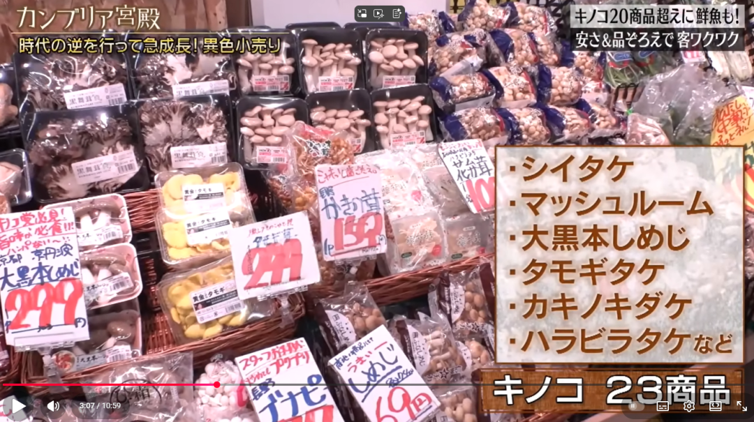 東京電視臺(tái)的一檔節(jié)目,曾探訪八百鮮大阪野田總店。從節(jié)目中可以看到,僅蘑菇類,店內(nèi)就有23個(gè)品種。除了香菇這種常見品種外,還有蟹味菇、寬鱗大孔菌等各種五花八門的菌菇食材。