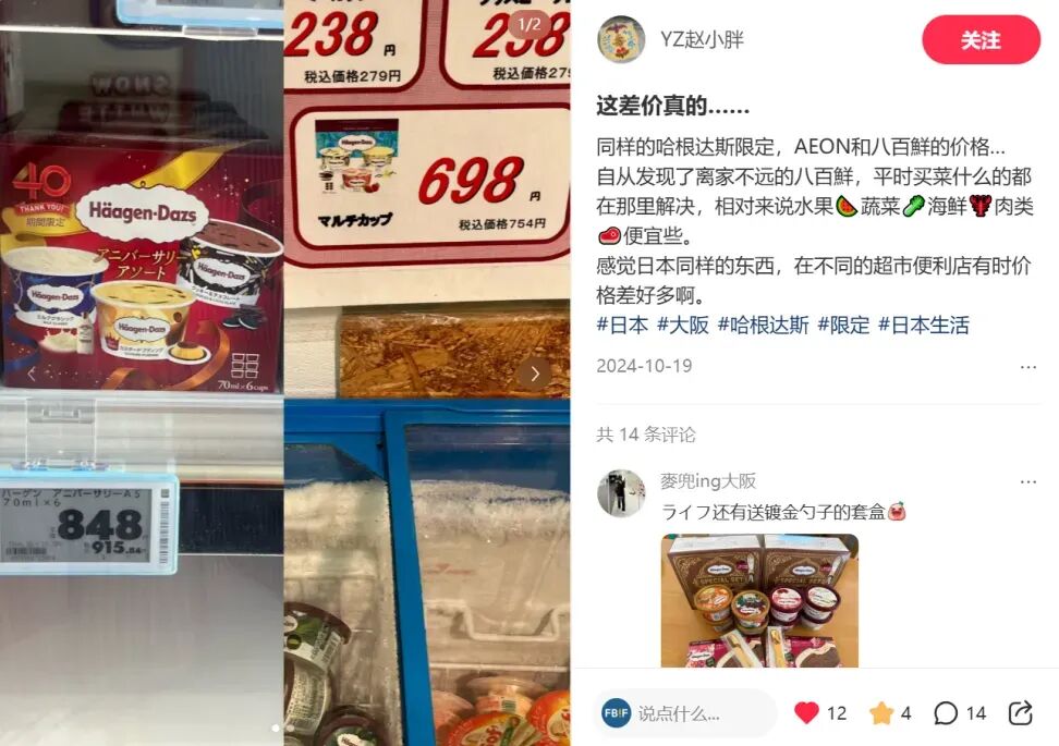 在野田總店,長野產(chǎn)的生菜的價(jià)格,只有市場(chǎng)價(jià)的三分之一左右;其它超市賣到6000日元(約合人民幣280.31元)的靜岡產(chǎn)皇冠蜜瓜,在這里只賣2700日元(約合人民幣126.14元);宮崎產(chǎn)的芒果,市場(chǎng)價(jià)超2000日元(約合人民幣93.44元),這里只賣1079日元(約合人民幣50.41元)。還有網(wǎng)友發(fā)現(xiàn),就連哈根達(dá)斯冰淇淋,在八百鮮的銷售價(jià)格也比隔壁永旺便宜100多日元。