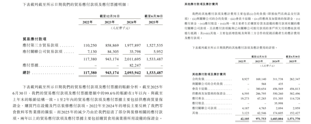 以萬辰集團為例,今年上半年,其負債總額達到51.24億元,其中流動負債為43.99億元。而在流動負債中,“貿易應付款”為15.33億元,“其他應付款項”為15.72億元。