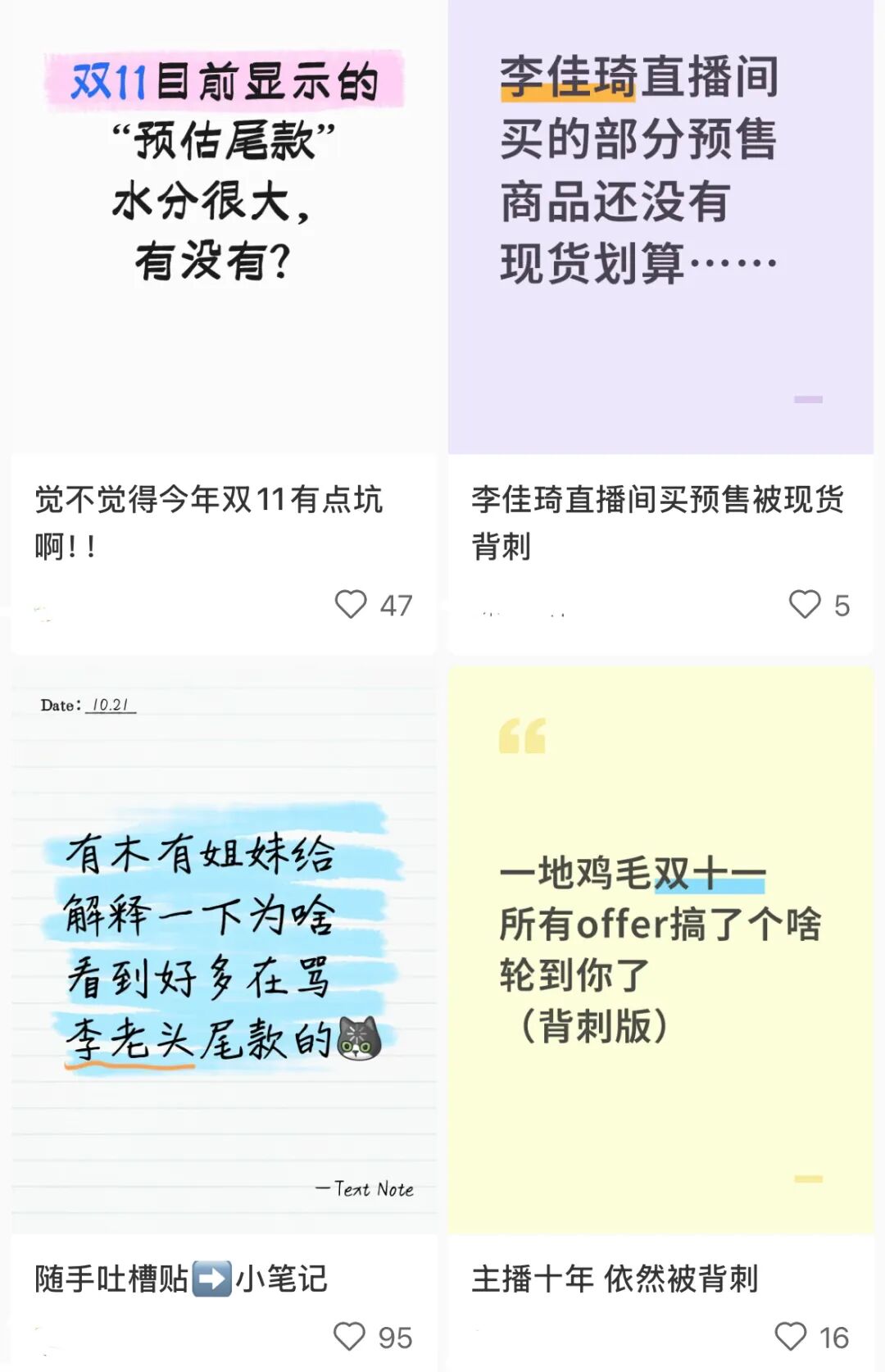 然而,在這些看似亮眼的數(shù)據(jù)背后,今年的雙11在社媒平臺(tái)上充斥著有關(guān)集體退款、品牌背刺、平臺(tái)規(guī)則模糊等各類現(xiàn)象的筆記。