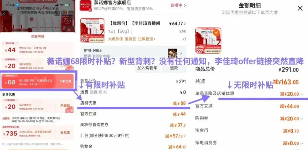 不過,薇諾娜對(duì)于20日晚23點(diǎn)發(fā)放的少量立減68元的優(yōu)惠券,表示并不知情,經(jīng)與主播和平臺(tái)方溝通,表示該批優(yōu)惠券系平臺(tái)隨機(jī)限時(shí)發(fā)放,與品牌方無關(guān)。