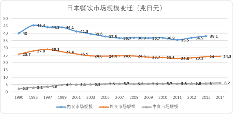 如果從1985年開始算,二十年間整整下降了約20%。在這種情況下,“內(nèi)食”(在家做飯)和“外食”(外出就餐)雙雙縮水,“中食”(快餐與便利店食品)則逆勢(shì)增長三倍。