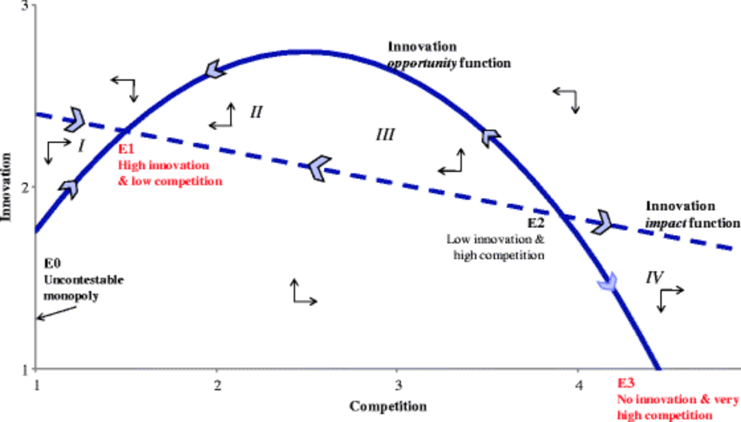 2025年的諾貝爾經(jīng)濟學家獲得者阿吉翁和豪伊特,用一個“倒U型曲線”來解釋競爭對創(chuàng)新的影響,核心結(jié)論是:適度競爭的環(huán)境,才是最適合創(chuàng)新的環(huán)境。