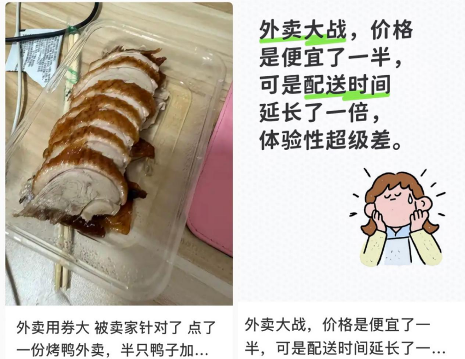 而市場的供需兩端,長期由一方讓利,必然是不可持續(xù)的。這些被壓縮的利潤積攢下去,最終很難不殃及消費者。社交平臺上,已有不少消費者反饋,看似薅到羊毛,實則收到的餐品偷工減料,而且當騎手壓力過載時,配送時間翻倍或是不送貨上門的現(xiàn)象也常有。