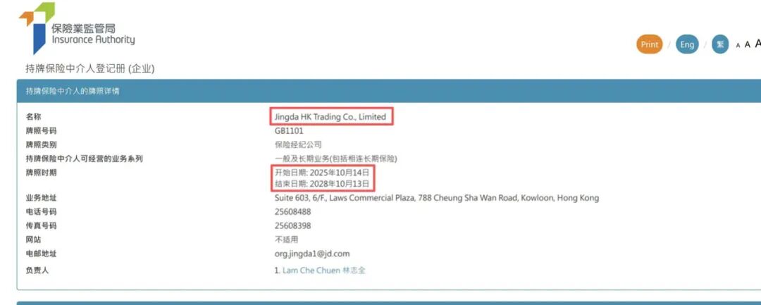 10月14日,據(jù)香港保險(xiǎn)業(yè)監(jiān)管局登記資料顯示,一家名為Jingda HK Trading Co., Limited的公司正式拿到香港保險(xiǎn)經(jīng)紀(jì)牌照,可經(jīng)營(yíng)的業(yè)務(wù)為一般及長(zhǎng)期業(yè)務(wù)(包括相連長(zhǎng)期保險(xiǎn)),有效期至2028年10月13日。