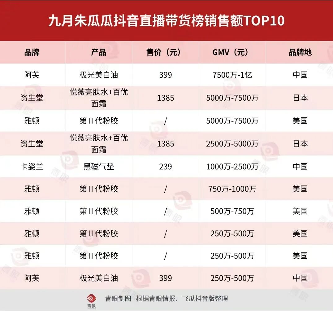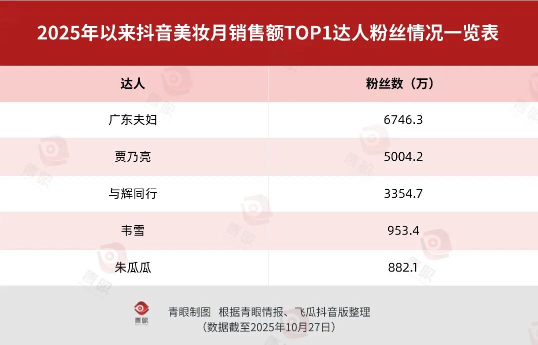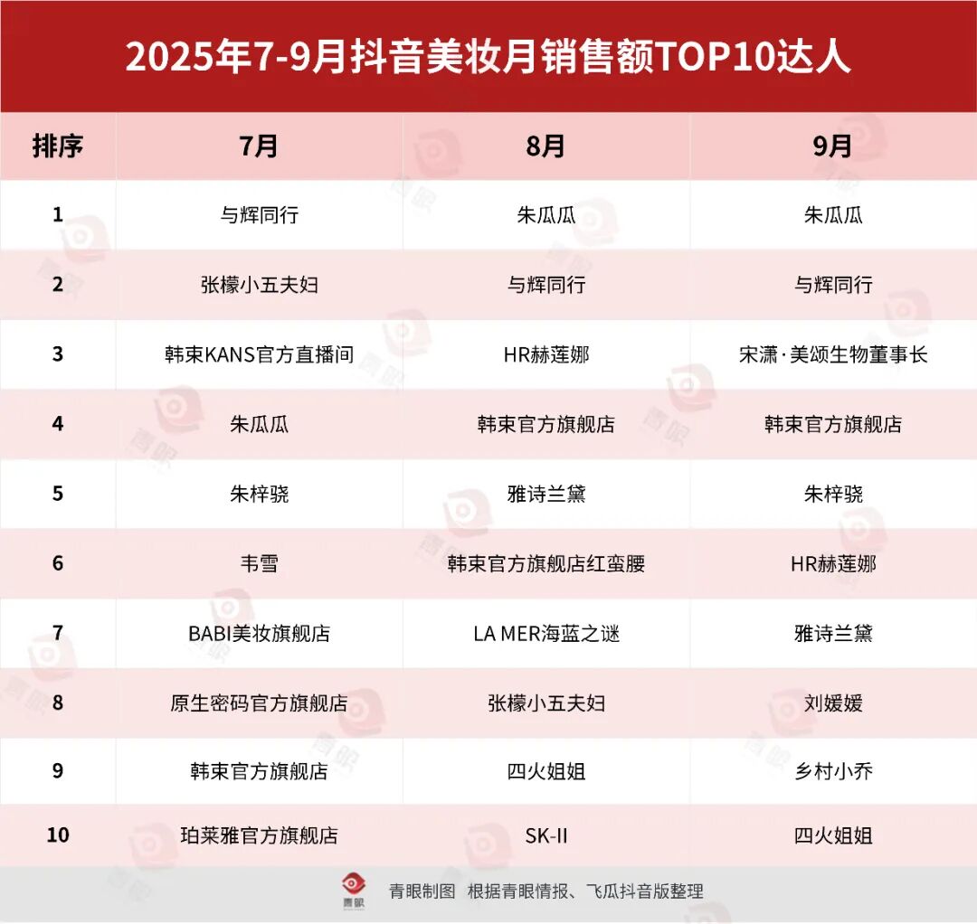 青眼統(tǒng)計(jì)發(fā)現(xiàn),2025年前九個(gè)月抖音美妝月銷售額TOP10帶貨達(dá)人中,朱瓜瓜三次登頂?shù)谝,超越廣東夫婦、韋雪等熱門主播,成為截至目前今年登頂月榜次數(shù)最多的主播。