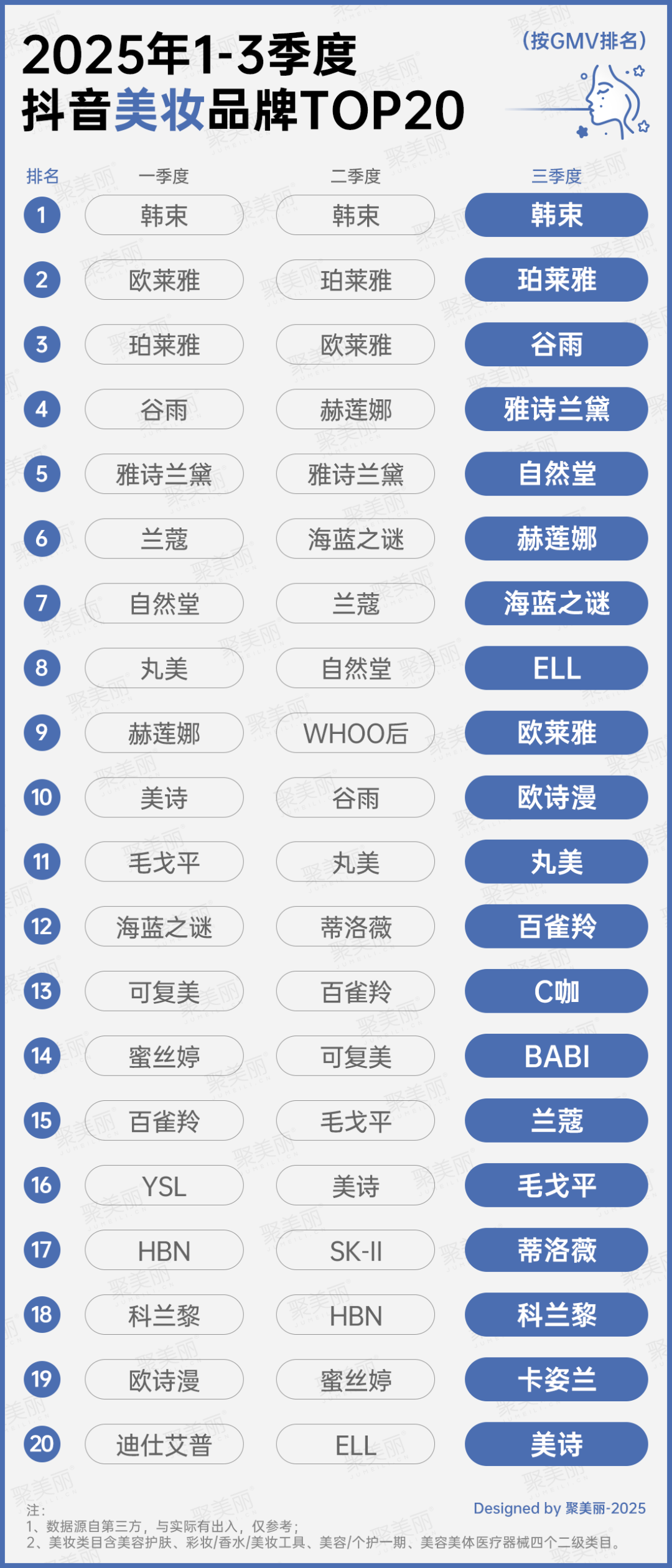 韓束蟬聯(lián)三季度榜首,珀萊雅在二、三季度穩(wěn)居亞軍。相較之下,一季度曾高居第二名的歐萊雅則大幅下滑,三季度跌至第12名。