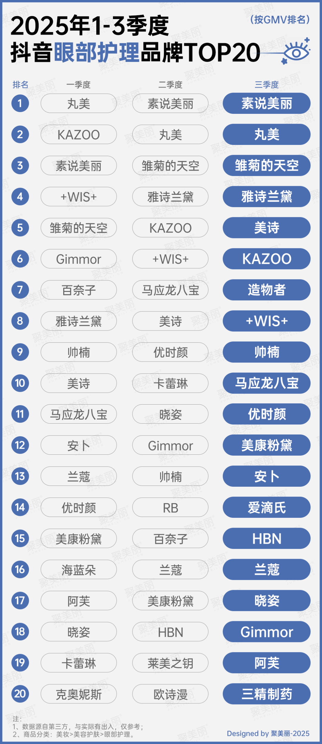 從眼部護(hù)理榜單TOP20來(lái)看,靠眼霜起家的丸美在一季度登頂TOP1,后續(xù)則是知名白牌素說(shuō)美麗持續(xù)霸榜。同時(shí),雛菊的天空、優(yōu)時(shí)顏等擁有眼霜大單品的新銳也在榜。國(guó)際大牌中,雅詩(shī)蘭黛在二、三季度均進(jìn)入TOP5,蘭蔻也擠進(jìn)TOP20。