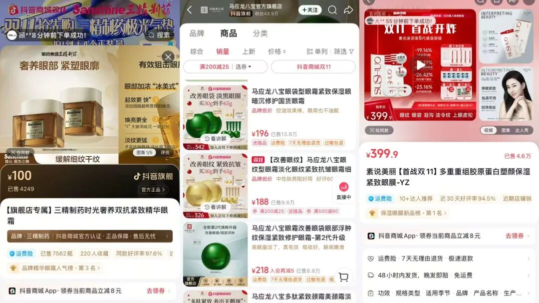 另一大藥企三精制藥則在2018年便試水美妝產(chǎn)業(yè),但此前表現(xiàn)平平。直至今年8月,三精制藥月GMV沖進(jìn)千萬(wàn)級(jí)別,次月更是達(dá)1億+。第三方數(shù)據(jù)顯示,三精制藥美妝在三季度TOP5爆品為氣墊霜組合、氣墊霜雙瓶套組、特潤(rùn)霜三瓶套組、抗皺精粹水和精華眼霜雙瓶套組。其中精華眼霜雙瓶套組季度GMV達(dá)1000W-2500W,該產(chǎn)品的打法與馬應(yīng)龍八寶眼霜如出一轍,接近100%達(dá)人份額來(lái)自與輝同行。