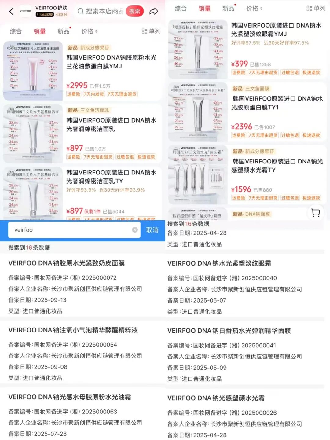 企查查顯示,其商標(biāo)歸屬2024年3月創(chuàng)立的中國(guó)香港藍(lán)沃(環(huán)球)有限公司,但抖音端自稱“韓國(guó)院線尖端科學(xué)美容護(hù)膚品牌”。從化妝品監(jiān)管APP來(lái)看,VEIRFOO累計(jì)備案16款產(chǎn)品,首個(gè)產(chǎn)品備案于今年4月,備案方為長(zhǎng)沙市聚新創(chuàng)恒供應(yīng)鏈管理有限公司,生產(chǎn)方為韓國(guó)CNP有限公司。