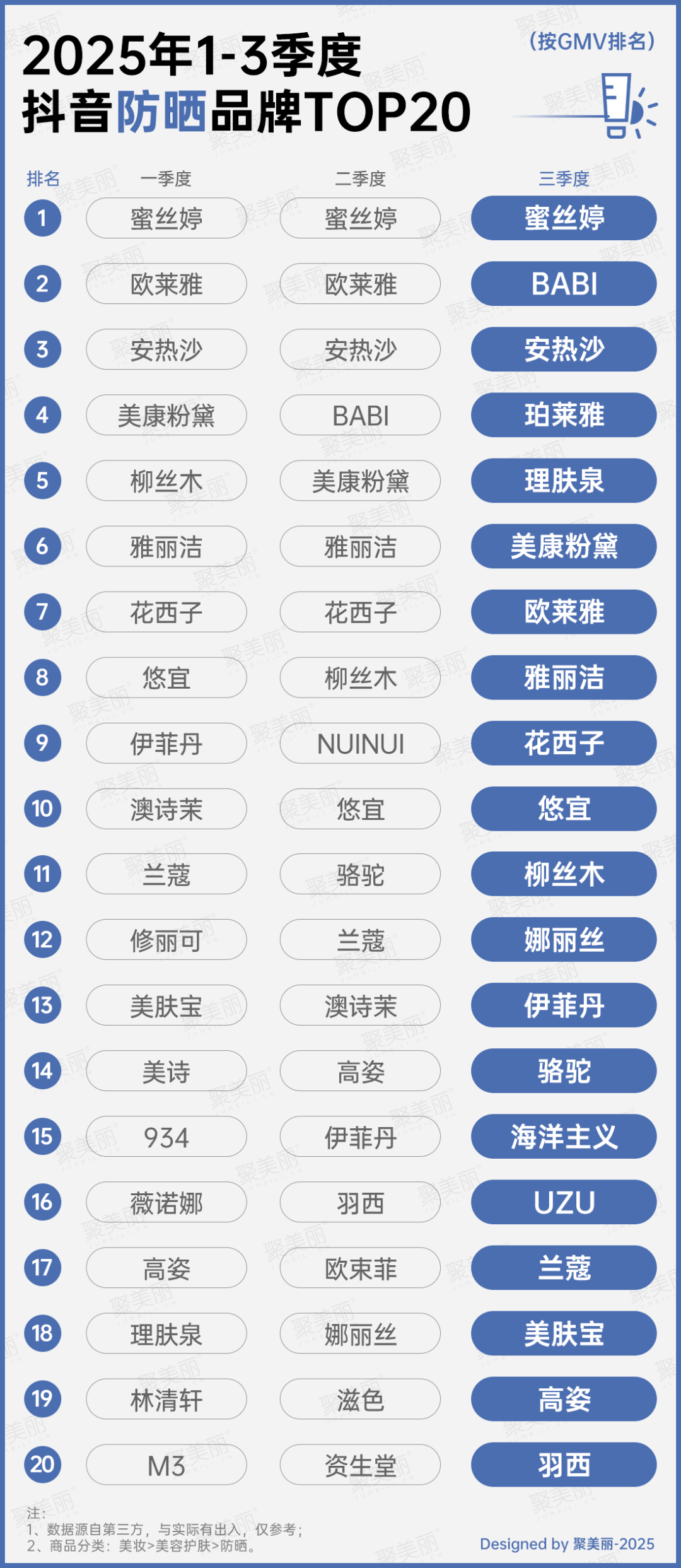 就防曬榜單TOP20來(lái)看,M3、UZU、NUINUI及駱駝等均屬于較新面孔,而蜜絲婷持續(xù)霸榜TOP1。