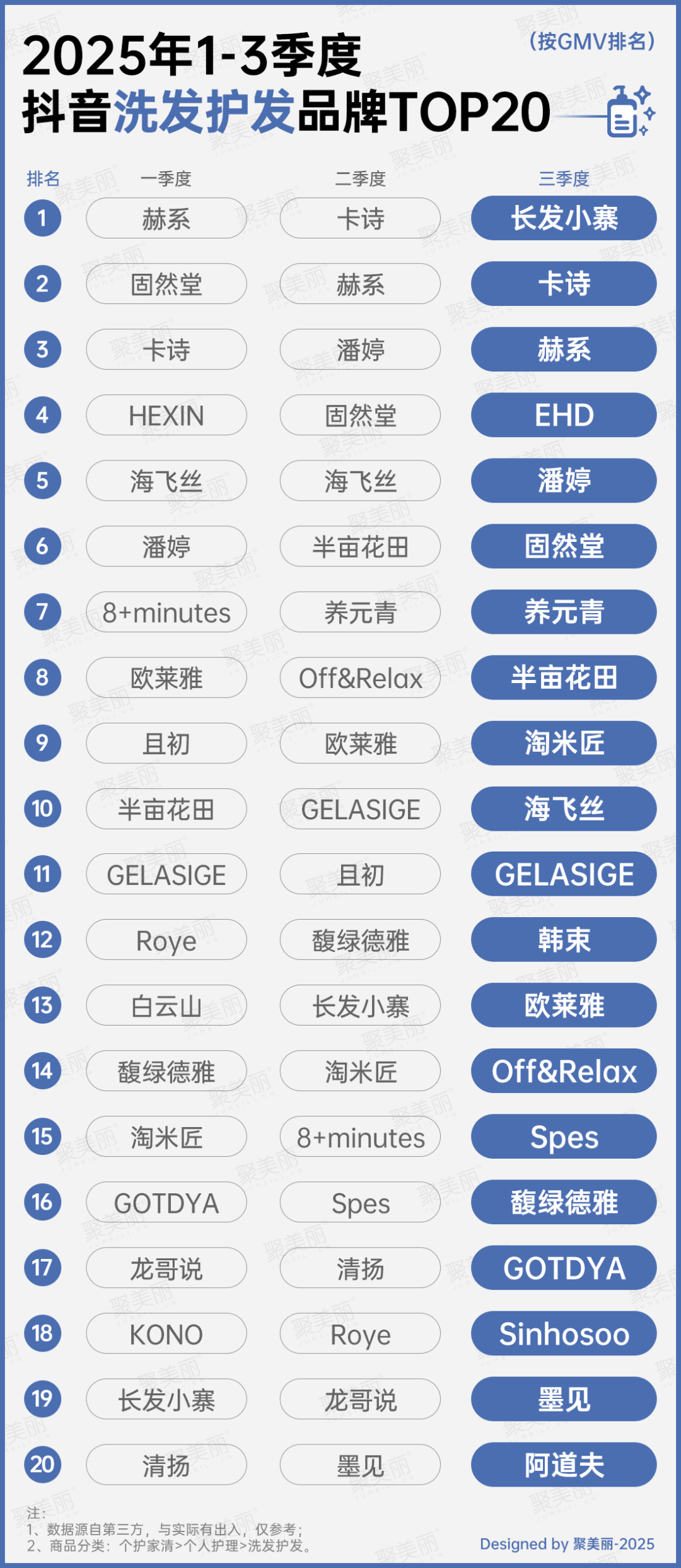 從洗發(fā)護(hù)發(fā)品牌TOP20榜單來(lái)看,各季度TOP1均不同,1-3季度分別是赫系、卡詩(shī)和長(zhǎng)發(fā)小寨,前二者排名穩(wěn)定在TOP3。同時(shí),還有較為明顯的趨勢(shì),國(guó)貨品牌逐漸占領(lǐng)該榜,其中不乏大集團(tuán)子品牌,如珀萊雅旗下Off&Relax二、三季度位居第8和14名,而云南白藥旗下養(yǎng)元青位列第7。