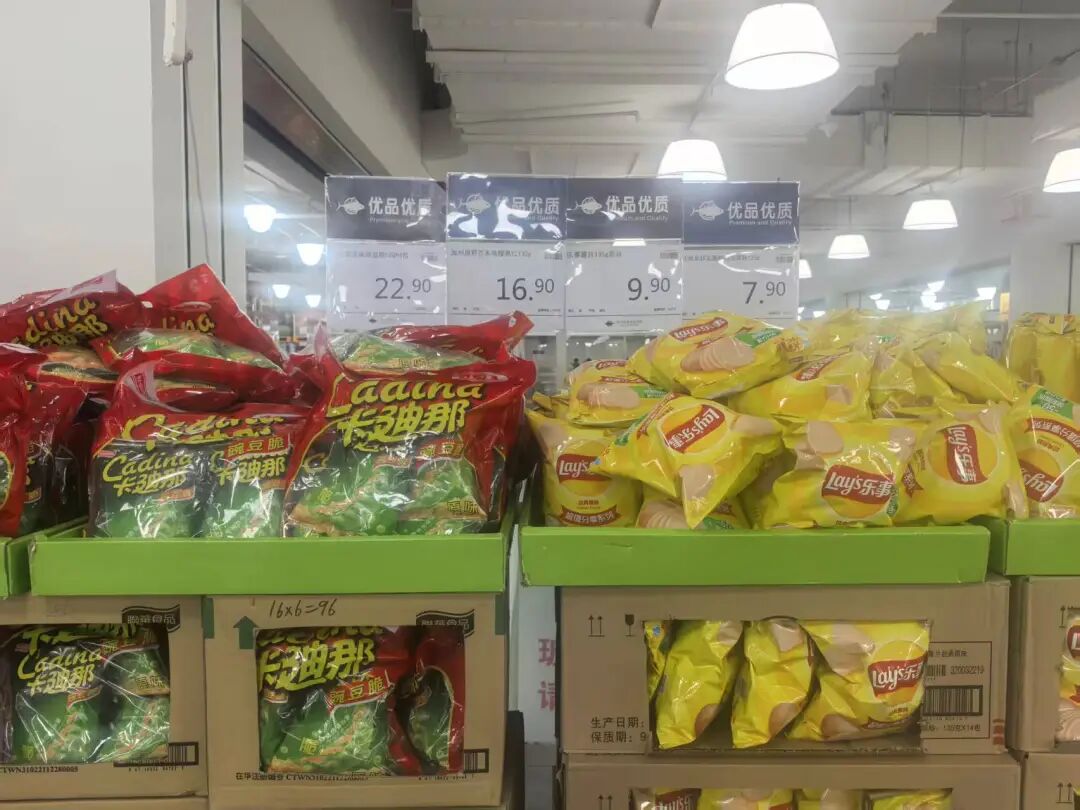 基本沒有裝修的吊頂和大臺(tái)燈般的照明,裝修上應(yīng)該省了不少錢,但在美食街區(qū)都是重投入的設(shè)備。但這些絲毫不影響消費(fèi)者的購(gòu)物熱情,因?yàn)樗幸粋(gè)殺手锏,就是極致性價(jià)比,記者簡(jiǎn)單拍了幾組幾個(gè),大家看看自己對(duì)比,絕對(duì)做到了極致性價(jià)比,當(dāng)然這些也來(lái)源于寬類窄品下的極簡(jiǎn)SKU,門店的商品數(shù)量并不多,但每個(gè)類別都是爆款,都極具性價(jià)比。我們來(lái)看一組圖片。