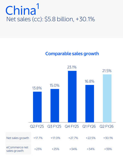 ▲2026財(cái)年第二季度沃爾瑪中國(guó)業(yè)績(jī)數(shù)據(jù) 圖源:沃爾瑪中國(guó)官微
