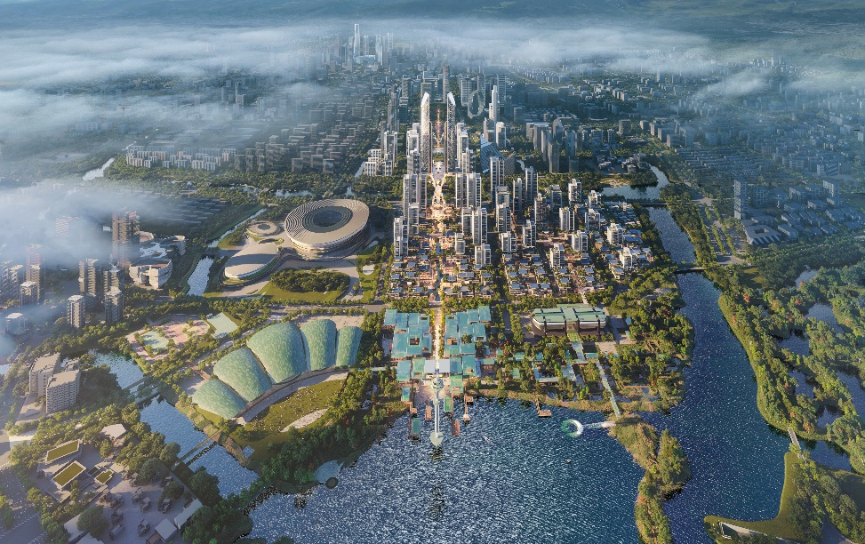 此次發(fā)布的項目效果意向圖,從“流水中的光影”提取靈感,融合現(xiàn)代語言與在地文化元素,展現(xiàn)出動靜相宜的視覺張力和兼具國際視野與江南韻味的城市地標(biāo)形象。