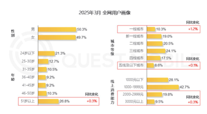 根據(jù)第七次全國人口普查數(shù)據(jù),我國60歲及以上老年人口已達2.64億。同時根據(jù)QuestMobile統(tǒng)計顯示,截至2025年3月,我國51歲以上銀發(fā)互聯(lián)網(wǎng)用戶占比持續(xù)提升,已達到26.8%。