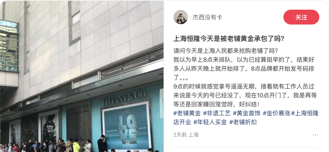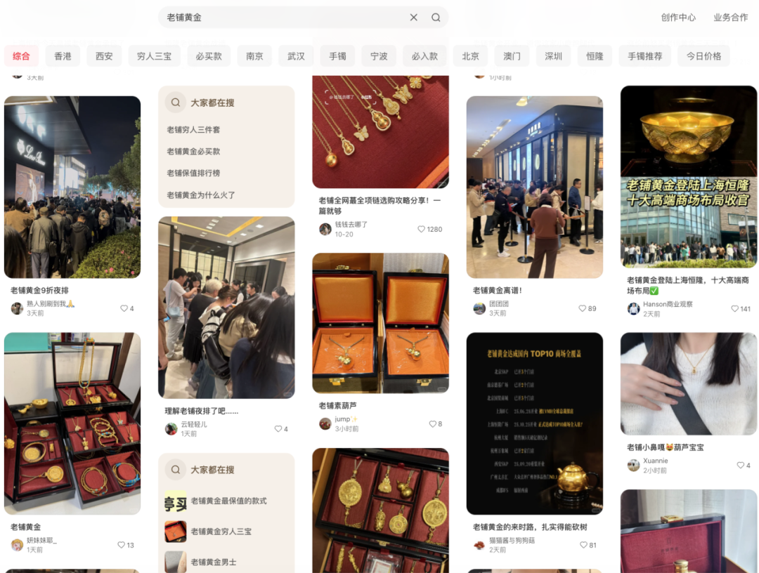 店門(mén)口的牌子上寫(xiě)著:“部份款式已經(jīng)斷貨”,小紅書(shū)上關(guān)于老鋪黃金“斷貨”“排隊(duì)攻略”“漲價(jià)款式”的帖子仍在刷屏。