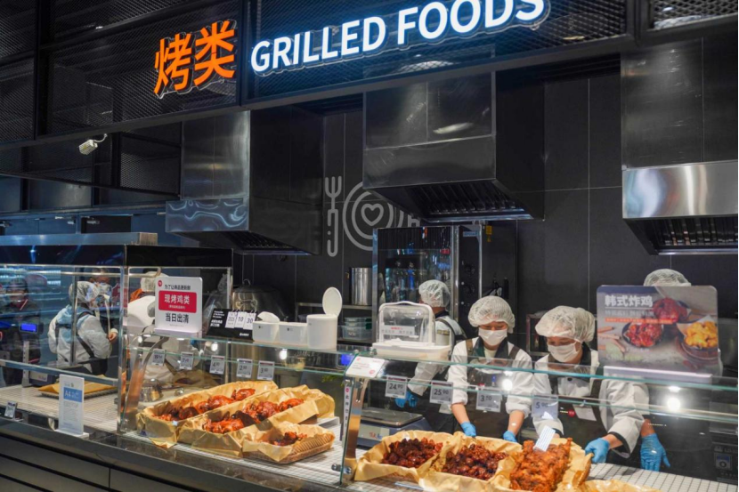 烘焙熟食區(qū)成為增強(qiáng)“煙火氣”的關(guān)鍵,現(xiàn)場(chǎng)制作包點(diǎn)、炸物、烤類、輕食、鹵味等,網(wǎng)紅商品如手撕雞、熱鹵甜腸、北京烤鴨、涼皮、榴蓮千層蛋糕等琳瑯滿目,讓顧客在賣場(chǎng)即可品嘗新鮮美食。