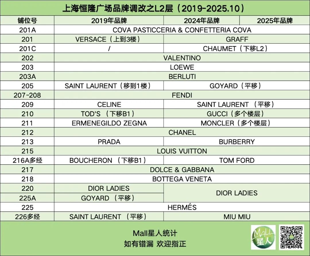 2020年,年滿20周歲的上海恒隆廣場(chǎng)開(kāi)始新一輪品牌升級(jí),故Mall星人選取2019年品牌表對(duì)比2025年,看下近6年每個(gè)鋪位的品牌變化,從中分析其最新的品牌迭代思路。