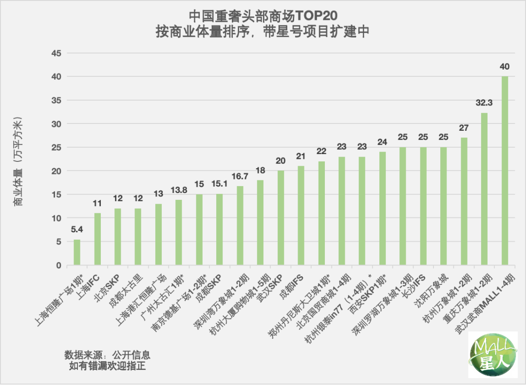 據(jù)Mall星人統(tǒng)計(jì),在全國(guó)銷售排名TOP20的重奢商場(chǎng)中,南京德基、北京國(guó)貿(mào)、深圳萬(wàn)象城、杭州大廈等半數(shù)項(xiàng)目均歷經(jīng)多輪擴(kuò)建,中型商業(yè)體量級(jí)別的商場(chǎng)僅剩上海恒隆廣場(chǎng)和香港中環(huán)置地廣場(chǎng)(不斷改造優(yōu)化的兩大典型),其余均為10萬(wàn)方以上乃至20萬(wàn)方以上的大型商場(chǎng)(深圳灣萬(wàn)象城二期于今年9月開(kāi)幕,擴(kuò)容成巨型MALL),如德基、IFC、IFS、太古里、太古匯、國(guó)貿(mào)、萬(wàn)象城、銀泰in77、阪急、港匯恒隆廣場(chǎng)等,其中南京德基、廣州太古匯、鄭州丹尼斯大衛(wèi)城、西安SKP、杭州in77、上海恒隆廣場(chǎng)正在擴(kuò)建中(排名不分先后)。