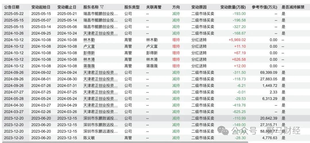 2025年2月,鯤鵬投資因自身資金需求計(jì)劃減持不超過716.9萬股,按2025年10月10日的股價計(jì)算,預(yù)計(jì)套現(xiàn)約22億元。與此同時,原第一大股東君正投資自2022年起多次減持,累計(jì)套現(xiàn)約33.71億元,其公開說明原因?yàn)椤白陨碣Y金需求”;蔡運(yùn)生、陳海明、陳義敏等其他股東也先后減持,分別套現(xiàn)約1707萬元、2161萬元和457萬元。