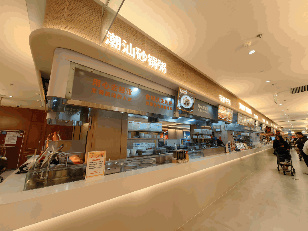 華豫佰佳規(guī)劃了沿墻一排的項(xiàng)目及三大島柜,匯集了當(dāng)下非常流行的即食小吃(包括炒酸奶、冰糖葫蘆、手工甜品、關(guān)東煮、爆汁烤腸、現(xiàn)烤披薩)、小餐飲(潮汕砂鍋粥、干炒河粉、江西拌粉、牛肉面、家常小炒、八寶粥、鐵板燒、小龍蝦、蜜汁小海鮮等)、炸物、美味熟食(出自中央廚房的鹵味、醬牛肉、八珍鹵味等各種熟食熱鹵,還有炒板栗、現(xiàn)烤雞鴨)以及各式面點(diǎn)(煎餃、包子、花卷等)。