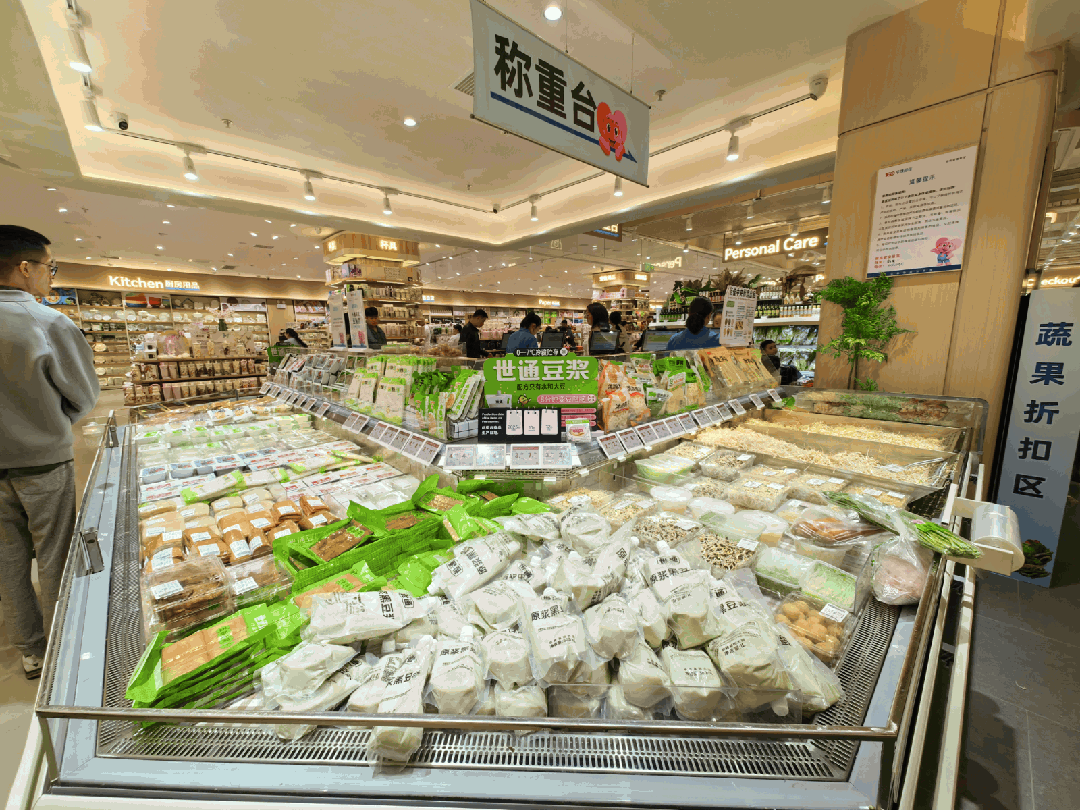 在蔬果稱重處,來自華豫佰佳中央廚房的豆制品,品種豐富、營造了安全放心的品質(zhì)銷售氛圍。
